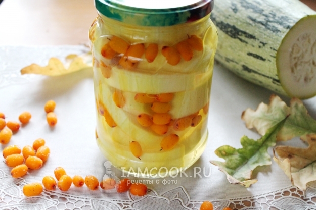 Ягоды облепихи, кроме натурального желтоватого цвета, придают кисло-сладкий вкус, который отлично впитывается нейтральным кабачком.