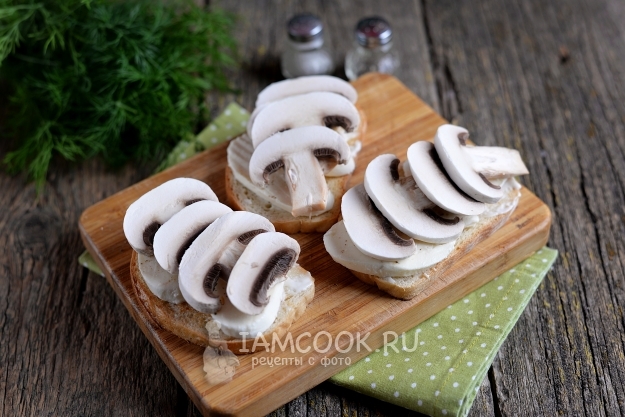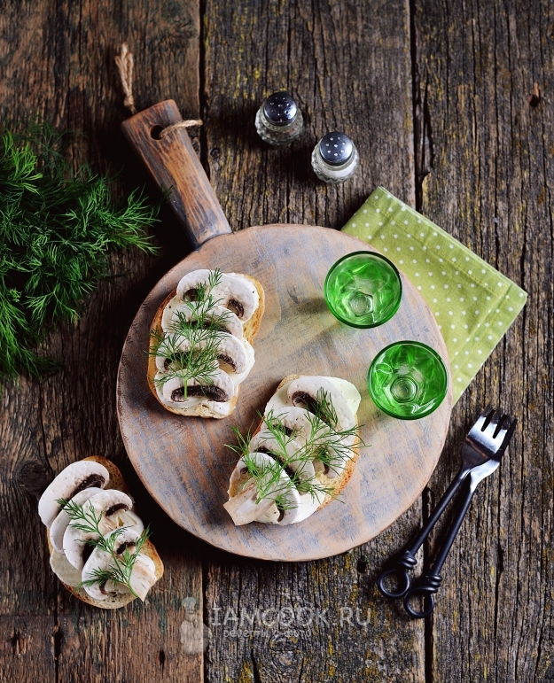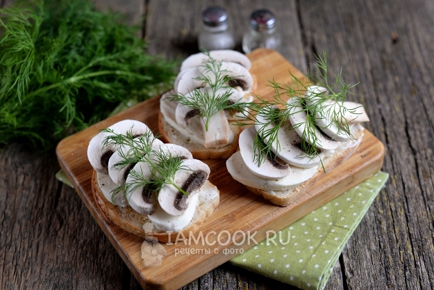 На стол бутерброды с сырыми шампиньонами подавайте в качестве закуски сразу же после приготовления.