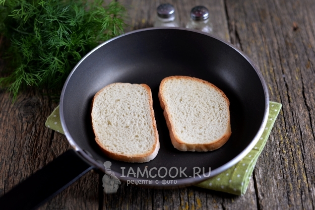 На сухой сковороде подсушите ломти белого или любого другого хлеба - вашего любимого. Снимите хлеб с плиты, остудите.