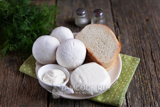 Продукты для приготовления бутербродов с сырыми шампиньонами подготовьте по списку. Грибы должны быть свежими, зачистите их чистой кухонной губкой от остатков компоста, очистите шляпки от кожицы, так они будут нежнее на вкус. Откройте моцареллу, сыворотку слейте, из нее можно что-то испечь - например, простой хлеб или пиццу.