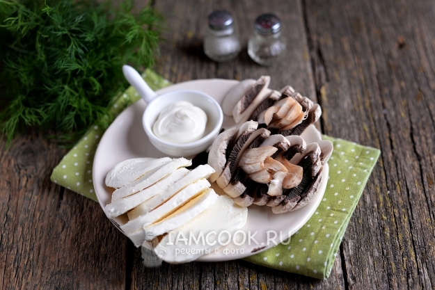 Сверху на моцареллу выкладываем по несколько ломтиков свежих тонко нарезанных шампиньонов. Их мы тоже чуть солим и перчим по вкусу. Также, по желанию, можно их слегка сбрызнуть соком лимона.
