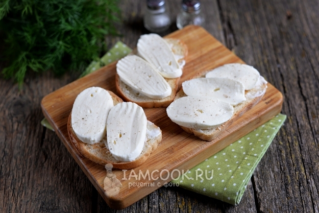 Теперь нужно выложить несколько ломтиков сыра на каждый бутерброд. Так как моцарелла пресная, мы должны ее слегка посолить и поперчить, то есть придать немного вкуса.