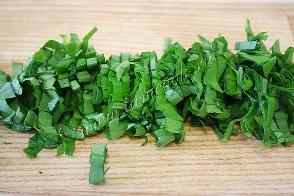 Листья черемши помойте. Обсушите на полотенце. Обрежьте ножки с листьев черемши. В пищу пригодны и луковицы и стебли черемши, но поскольку они немного жесткие для салата, то используйте только нежные листья. Листья нарежьте. (По желанию несколько листочков черемши можете оставить для украшения салата).