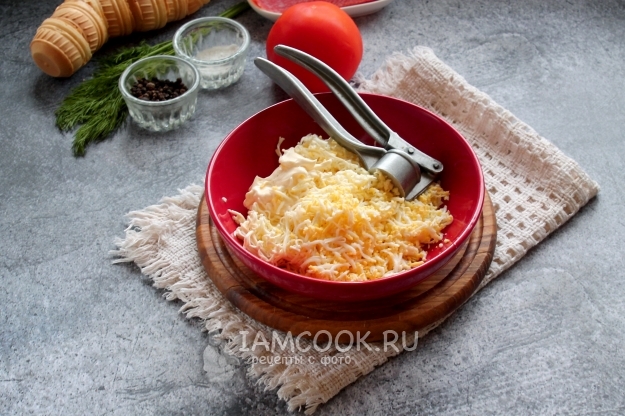 Отваренные вкрутую и охлажденные яйца, а также плавленый сыр трем тонкой стружкой. Добавляем соль, перец, майонез, измельченный чеснок. Перемешиваем.