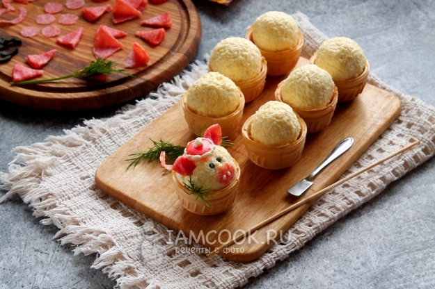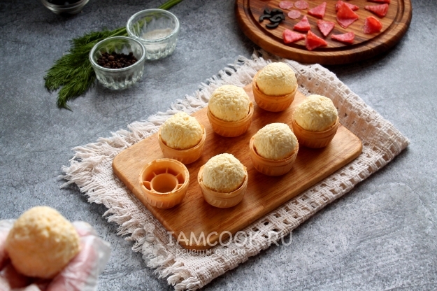 Из сырной массы скатываем шарики одинакового размера и помещаем в тарталетки.