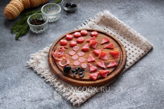 Рекомендую использовать колбасу типа салями очень тонкой нарезки. Гибкие колбасные слайсы не рвутся и благодаря жиру надежно держатся, не нужны ни шпажки, ни другой дополнительный крепеж.