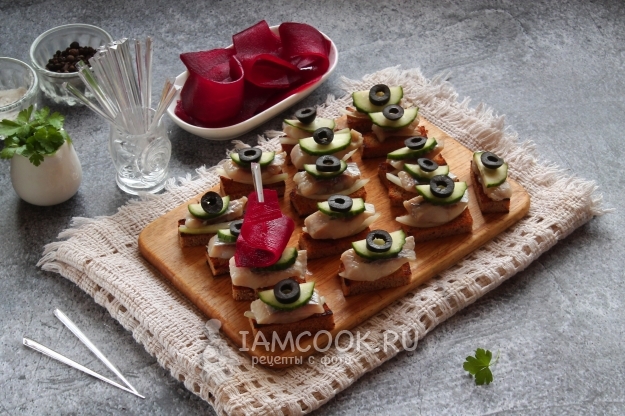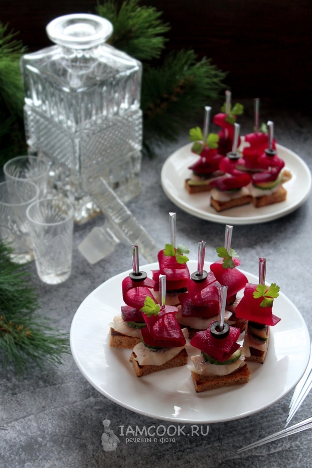 Чтобы приготовить канапе с селедкой и свеклой в домашних условиях, возьмите продукты по списку.