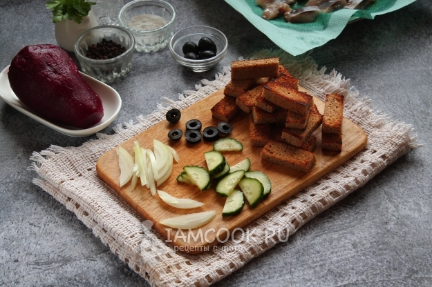 Вареную и остуженную свеклу очищаем. Шинкуем репчатый лук, кольцами нарезаем маслины без косточек и полукольцами — свежий огурец.