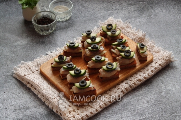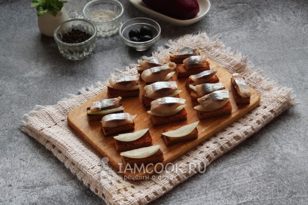 Собираем канапе: сперва на хлеб кладем лук, затем селедку.