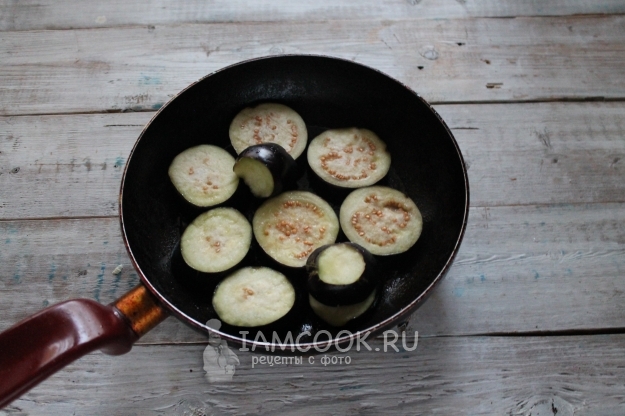 На сковороде с разогретым маслом обжарьте кружки баклажанов. Выложите на противень.