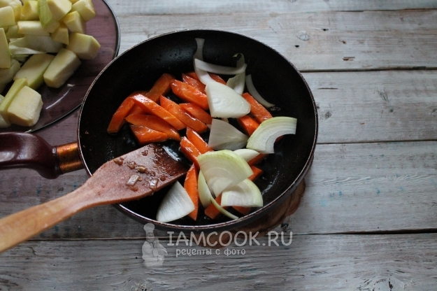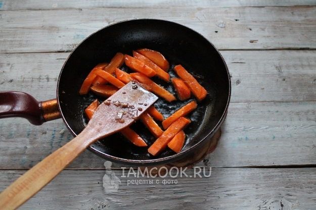 Продолжайте обжарку на той же сковороде, добавляя при необходимости масло, все остальные овощи. Следом идет морковь.