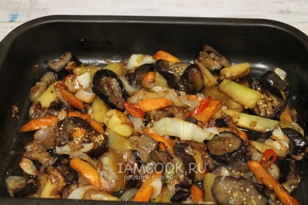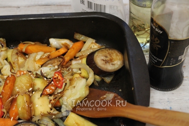 Сначала все овощи предварительно обжариваются на сковороде, а потом запекаются в духовке. Можно при желании довести рагу до готовности на сковороде под крышкой, не используя духовой шкаф. Но запеченные овощи в соевом соусе получаются однозначно вкуснее.