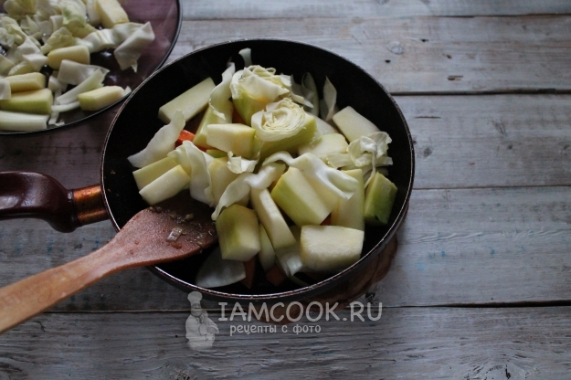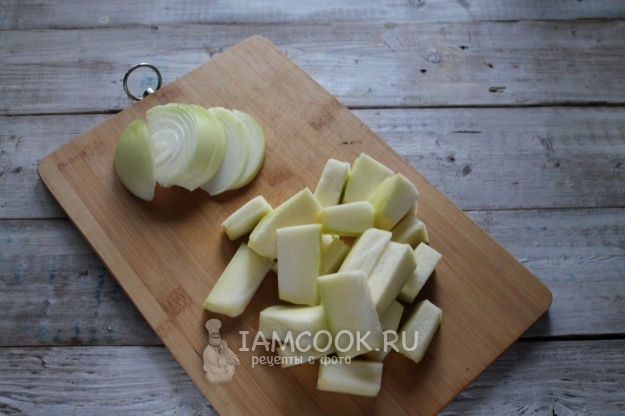 Кабачок очистите и удалите внутреннюю часть, крупно нарежьте. Большими полукольцами порежьте луковицу.