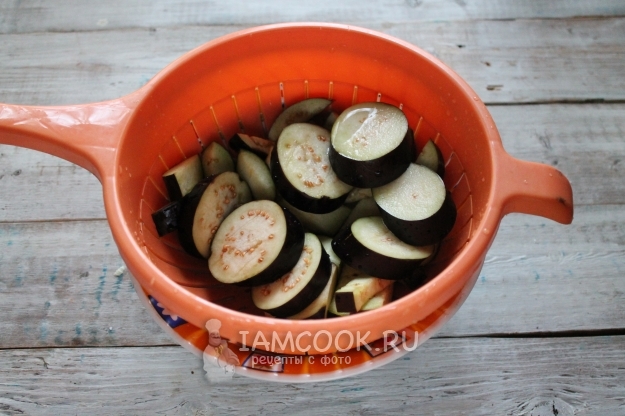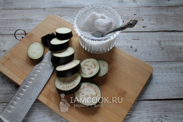 Баклажаны нарежьте крупными кольцами, засыпьте солью и вотрите ее, дайте постоять минут 10-15.