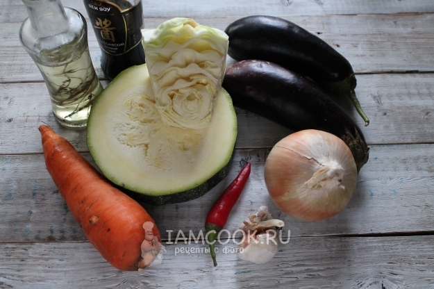 Продукты для приготовления овощей в соевом соусе в духовке подготовьте по списку.