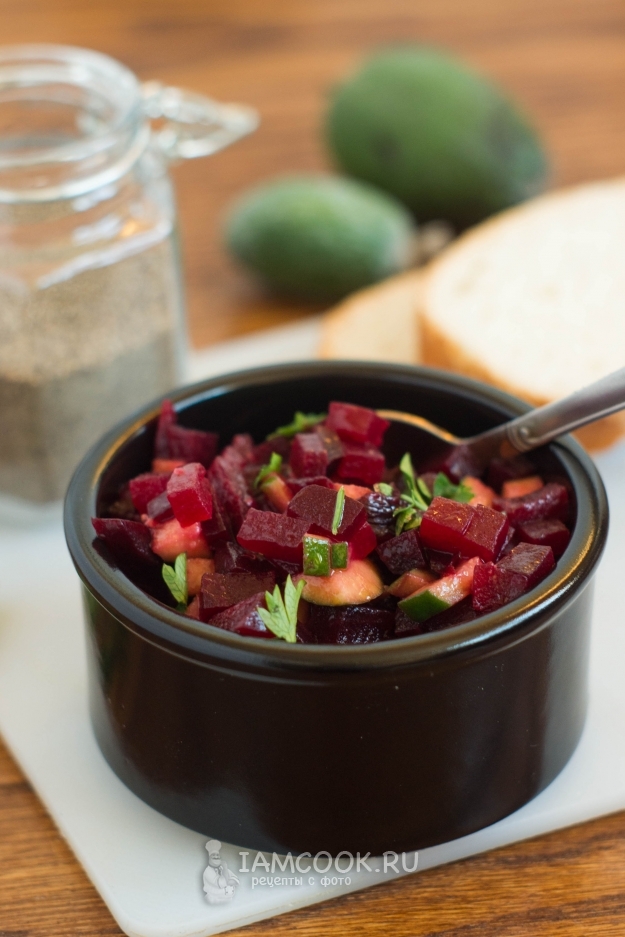 Подавать готовый салат из свеклы и фейхоа можно сразу же после приготовления.