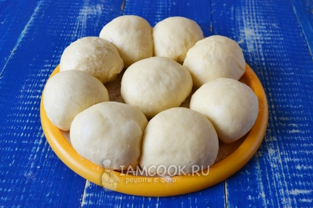 Берем основной кусок теста. Из 500 г дрожжевого теста может получиться 9-10 миниатюрных колобков, которые необходимо подкатать на мучной поверхности. Оставляем колобки на расстойку на 10 минут. Они должны стать пышными, а чтобы не заветрились - прикроем пищевой пленкой.