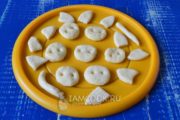 Один-два колобка раскатываем в тонкую лепешку. Вырезаем пятачки и ушки. Носики вырезаем крышкой от пластиковой бутылки. Дырочки – чистым стержнем от ручки. Ушки вырезаем кромкой рюмки. Хвостики хрюшки – это жгутики из теста.