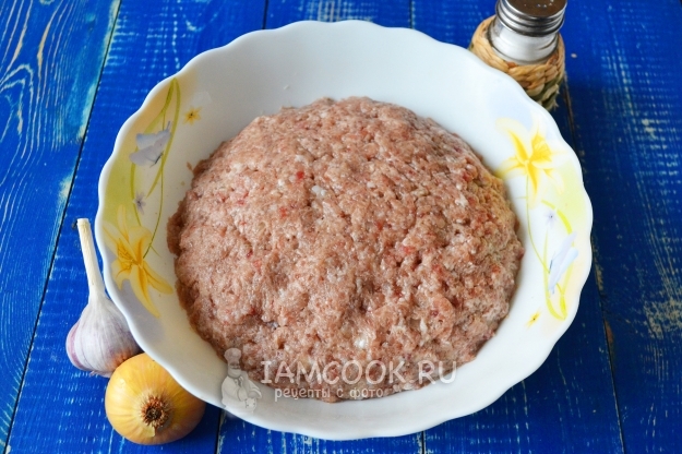 Для приготовления новогодней котлеты буду использовать домашний сборный фарш из говядины и курицы. Перекручиваем в фарш лук и чеснок. Хорошенько отбиваем руками. Добавляем соль.