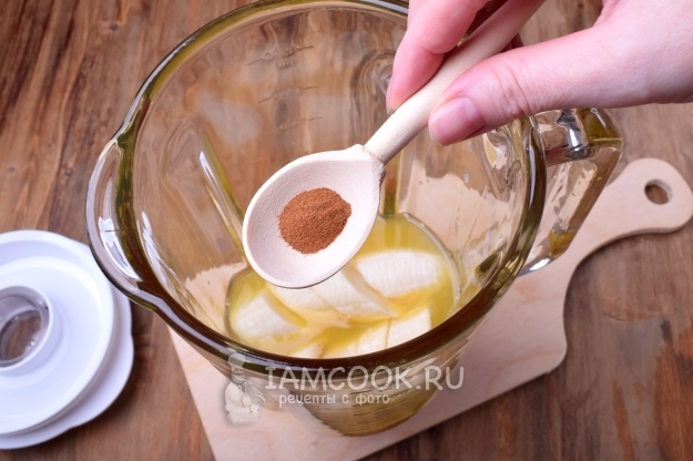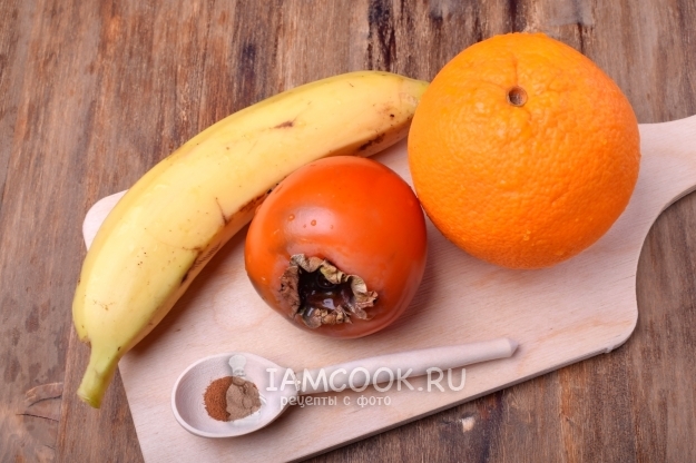 В чашу блендера выложим мякоть хурмы, кусочки банана, нальем сок апельсина и добавим молотую корицу.