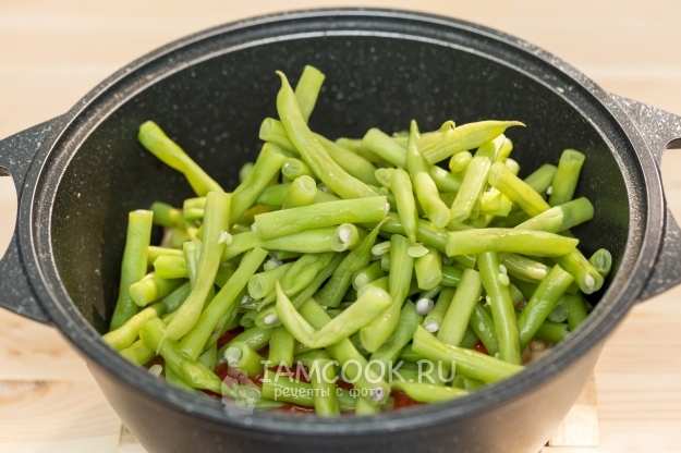 Стручковую фасоль нарежем, бланшируем в кипящей подсоленной воде минуты три.