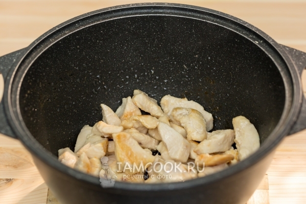 А теперь займемся курицей. Нарежем ее произвольными кусочками, обжарим на сильном огне на растительном масле до появления аппетитной корочки.