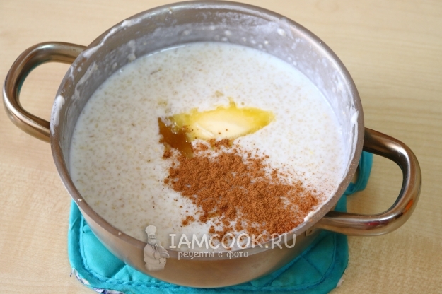 Снимаем с огня, добавляем в кашу сливочное масло, мёд и корицу.