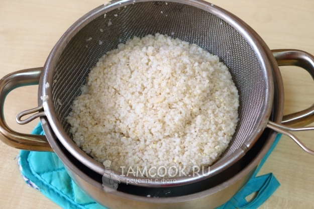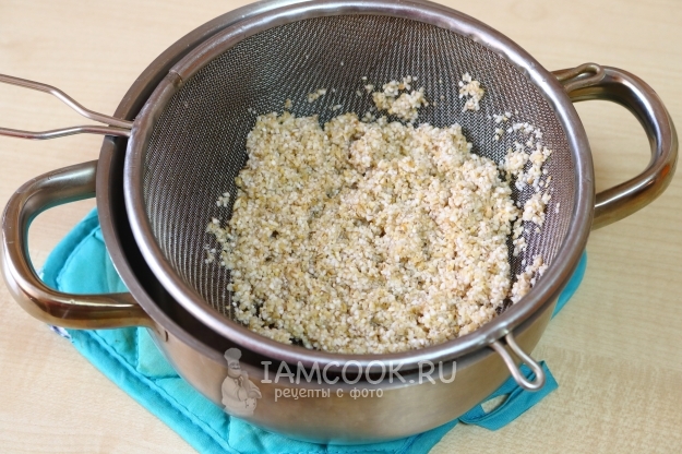 Теперь откидываем кашу на дуршлаг и даем лишней жидкости стечь.