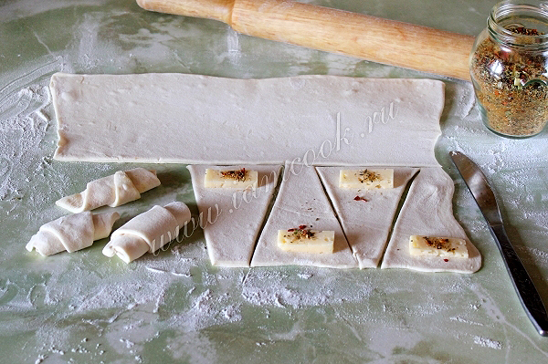 Каждый лист теста раскатайте немного в одном направлении, чтобы не нарушить слои. Нарежьте на треугольники, уложите по кусочку сыра и добавьте специи. Скатайте рогалики.