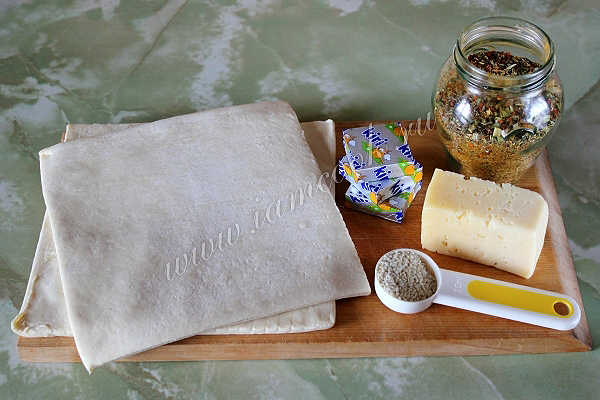 Подготовьте слоёное тесто, сыры и специи (тут итальянские травы с паприкой и сушеными помидорами) и кунжут по желанию.