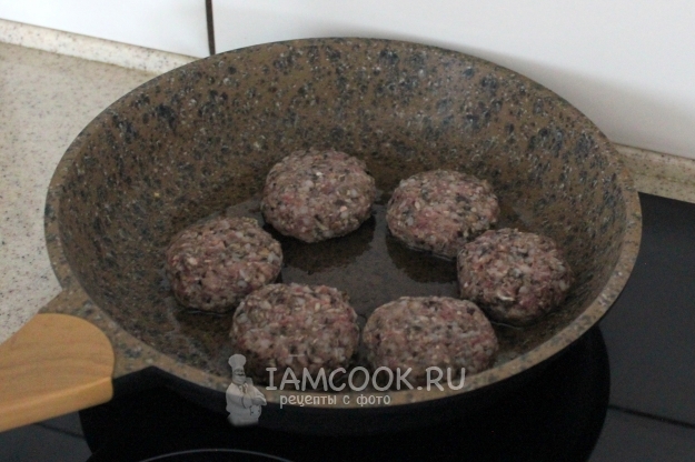 Сформируйте котлеты желаемой формы и размера. Обжарьте их с двух сторон на сковороде на растительном масле или на той же сковороде на остатках масла, на котором готовили лук и грибы.