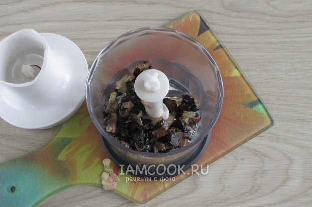 Затем лук и грибы нужно измельчить при помощи блендера.
