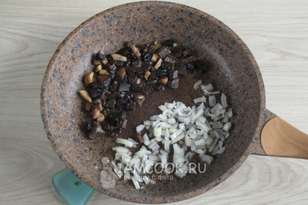 Кусочки грибов и мелко нашинкованный лук обжарьте на растительном масле вместе или отдельно друг от друга (по вашему желанию). Слегка посолите.