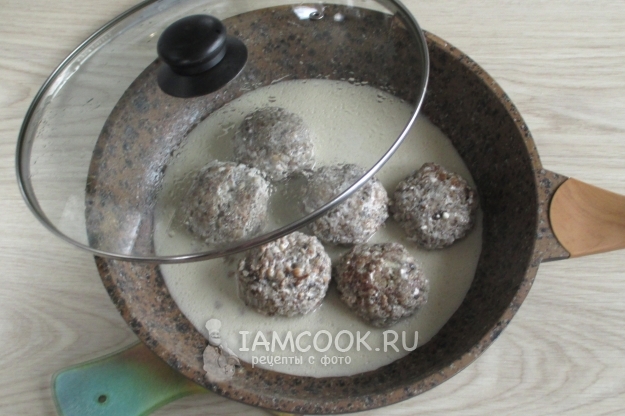Затем залейте гречаники сметаной, разведенной с водой примерно 1:1, и тушите их до готовности на среднем огне под крышкой.