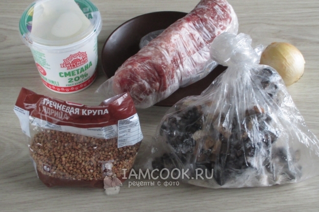 Для гречаников с замороженными грибами и фаршем подготовьте ингредиенты по списку к рецепту.