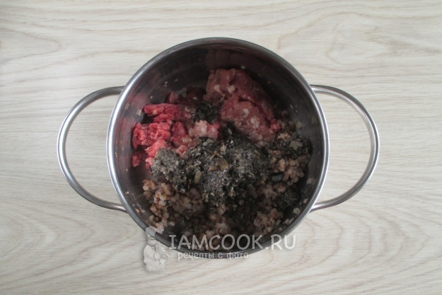 Соедините и перемешайте между собой гречку, мясной фарш и грибную массу.