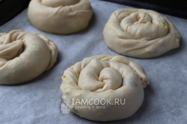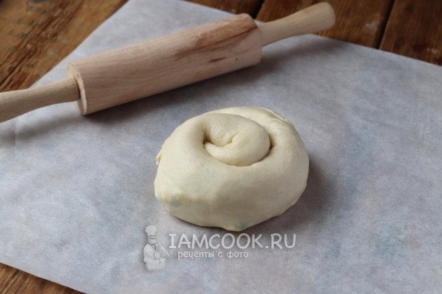 Сверните тесто в плотный рулет, а затем сформируйте улитку (как на фото).