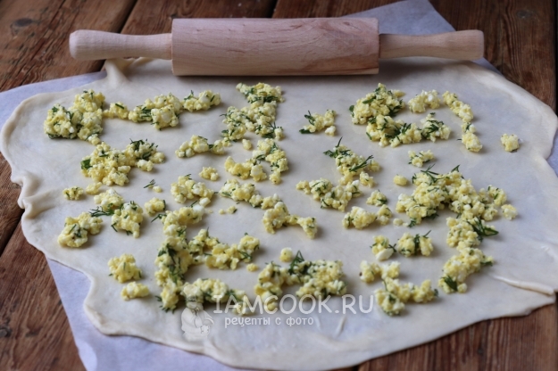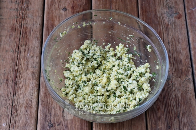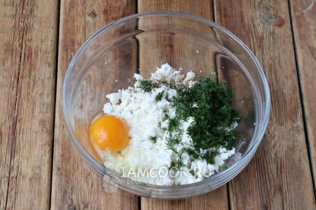 Тем временем займитесь начинкой. В подходящей ёмкости соедините брынзу, измельчённый укроп, яйцо и чёрный молотый перец. Так как брынза сама по себе имеет солоноватый вкус, дополнительно добавлять соли не следует.