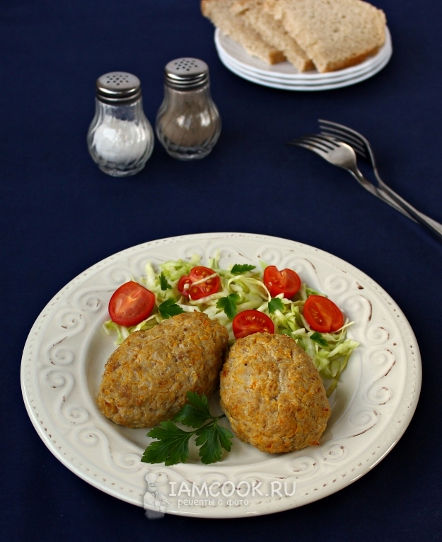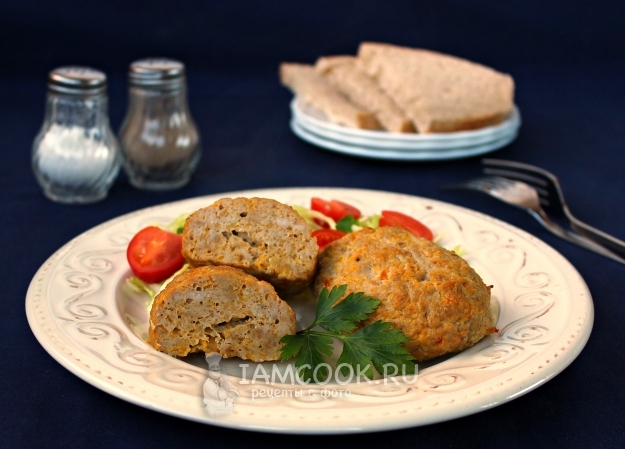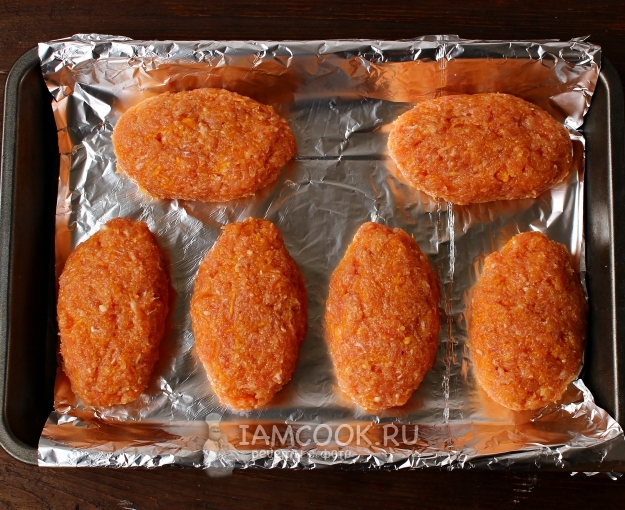 Из приготовленного фарша формируем котлеты и выкладываем их на противень, застеленный фольгой или силиконовым ковриком. Ставим противень в заранее разогретый до 190 градусов духовой шкаф, на средний уровень. Запекаем на режиме «верх-низ» до готовности, 25-35 минут (ориентируйтесь на свою духовку).