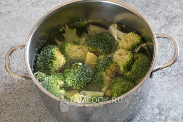 Заливаем брокколи с картошкой водой так, чтобы брокколи только-только начала всплывать, и варим на среднем огне при закрытой крышке 15 минут с момента закипания.