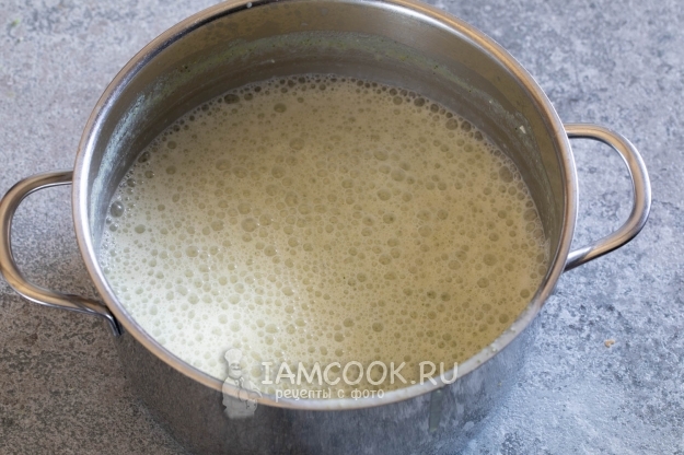В сварившийся до мягкости картошки суп добавляем кусочки плавленого сыра и тщательно взбиваем все блендером (до полного измельчения брокколи). Суп-пюре из брокколи с сыром покрывается в результате вот такой вот пышной белой пеной. Пока он свежевзбитый, даже почти не видно, что он на самом деле внутри зеленый. Солим на этом этапе, после введения сыра.