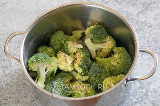 Брокколи разделяем на кусочки, которые реально уложить в один слой в кастрюлю.