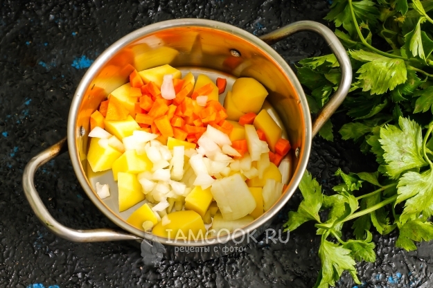 Очистите клубни картофеля, морковь и лук от кожуры, промывая в воде. Нарежьте картофель средними кубиками, а морковь и лук - мелкими. Добавьте в кастрюлю или казан.