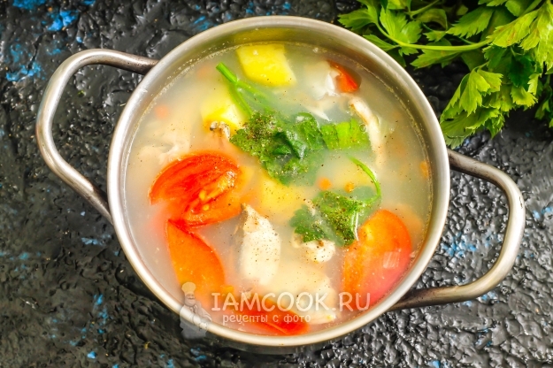 Промойте помидоры, нарежьте их ломтиками или кубиками - по желанию, и добавьте вместе с промытой зеленью сельдерея в емкость. Отварите еще 5 минут, поперчив и попробовав уху на вкус. Если любите чесночный аромат в блюде, то добавьте немного молотого сушеного чеснока или спрессуйте очищенный зубчик чеснока.