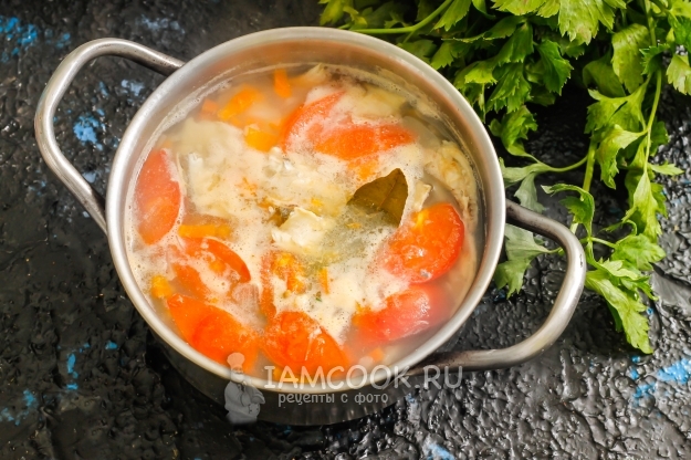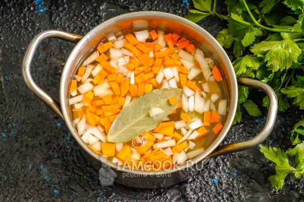 Влейте теплую воду, добавьте лавровые листья, соль и перец. Поместите кастрюлю на плиту и отварите овощные нарезки в течение 10 минут.