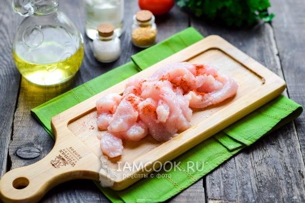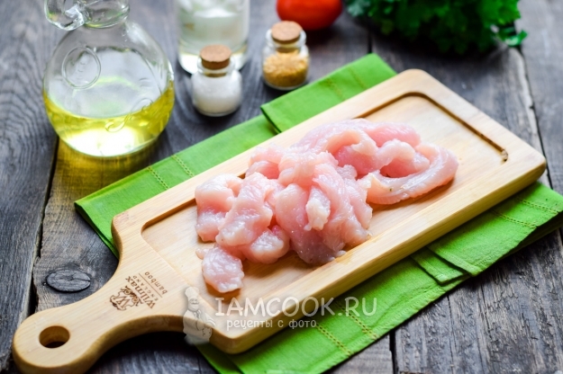 Ополоснуть и просушить свежее филе индейки. Мясо нарезать продолговатыми полосками.