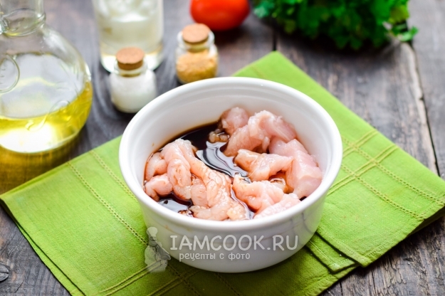 Далее переложить мясо в глубокую пиалу, влить соевый соус и хорошо все перемешать, оставить на 20 минут промариноваться. Любители сладкой нотки могут добавить пару капель меда.