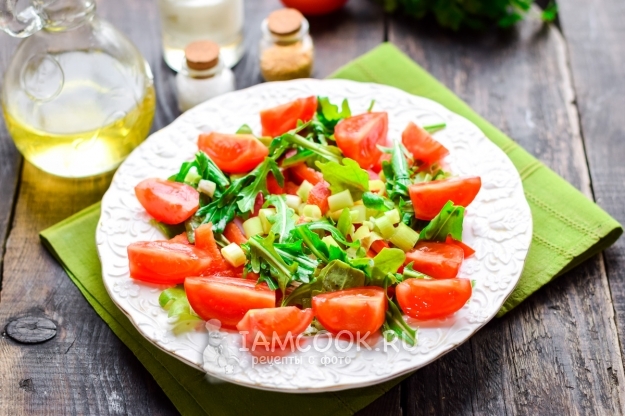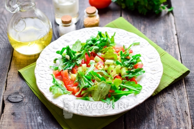 Подготовить тарелку для салата. Сладкий перец очистить и вымыть, нарезать полосками и уложить на тарелку. Рукколу и зеленый лук ополоснуть, просушить, произвольно нарезать, добавить к перцу.