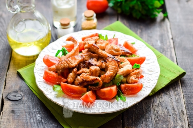 Промаринованные кусочки индейки обжарить в ложке растительного масла. Остудить мясо и переложить в салат.