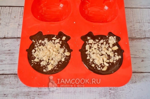 Добавим немного жареного арахиса и чуть притопим его. Форму с шоколадом ставим в холодильник для застывания.